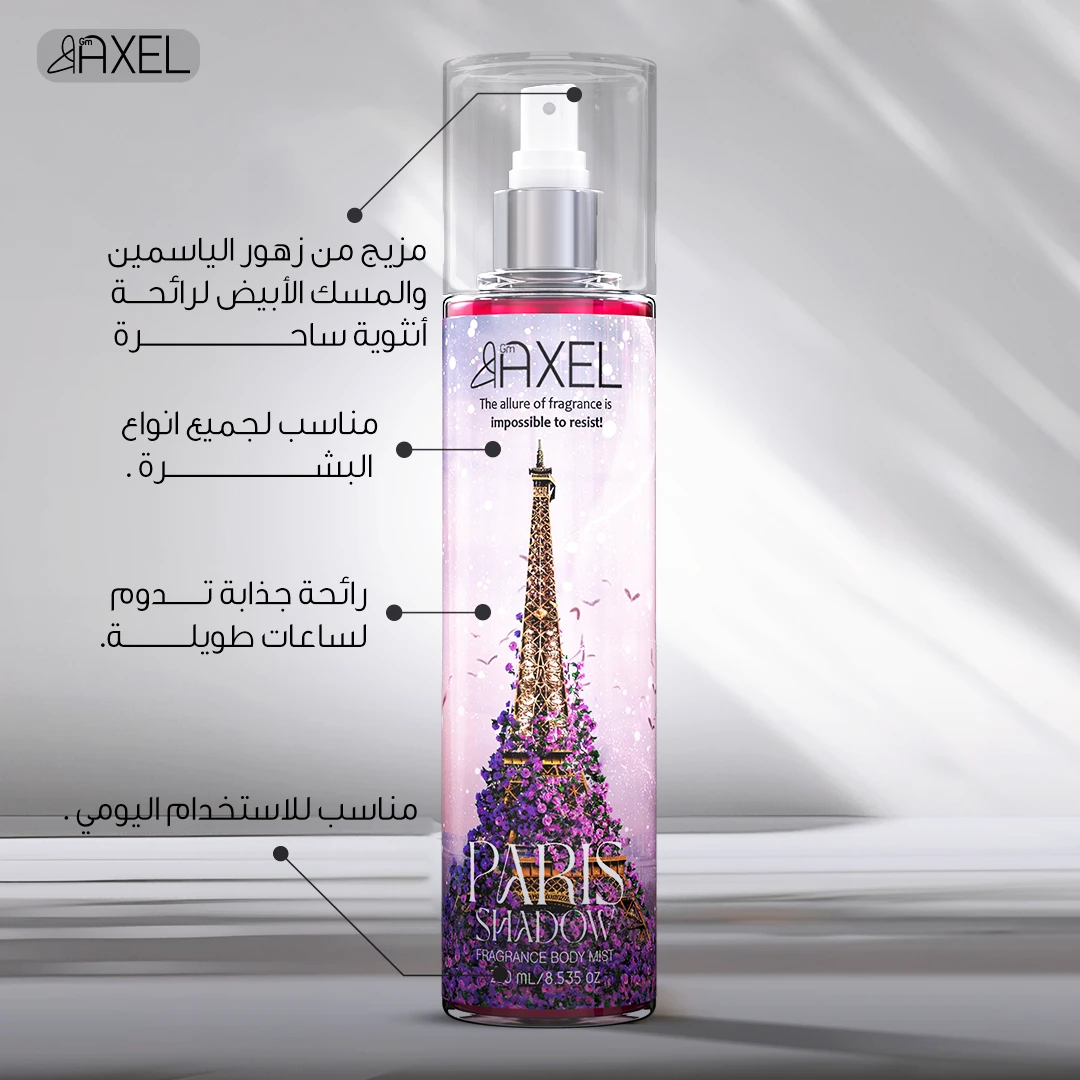 "تجربة باريس شادو بودي ميست الساحر، وهو عطر يجسد جوهر الرومانسية والأناقة. هذا الرذاذ المنعش ليس مجرد عطر، بل هو تجربة حقيقية تترك أثراً جميلاً على بشرتك. مصمم لتعطير وترطيب الجسم، يوفر إحساسًا دائمًا بالانتعاش بينما يكافح رائحة الجسم بفعالية. بفضل مزيجه الفريد من المكونات الطبيعية، يضمن هذا البودي ميست أن تبقي رائحتك جميلة طوال اليوم، سواء كنتِ في مناسبة خاصة أو ضمن روتينك اليومي. يتم تدليك البودي ميست بلطف على جميع أجزاء الجسم، خاصة على نقاط النبض، مما يزيد من فعالية العطر ويعزز استمتاعك به.