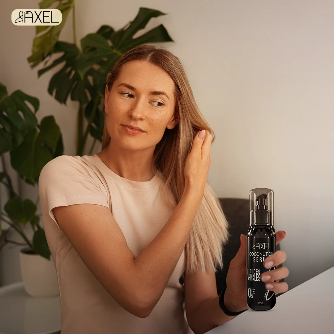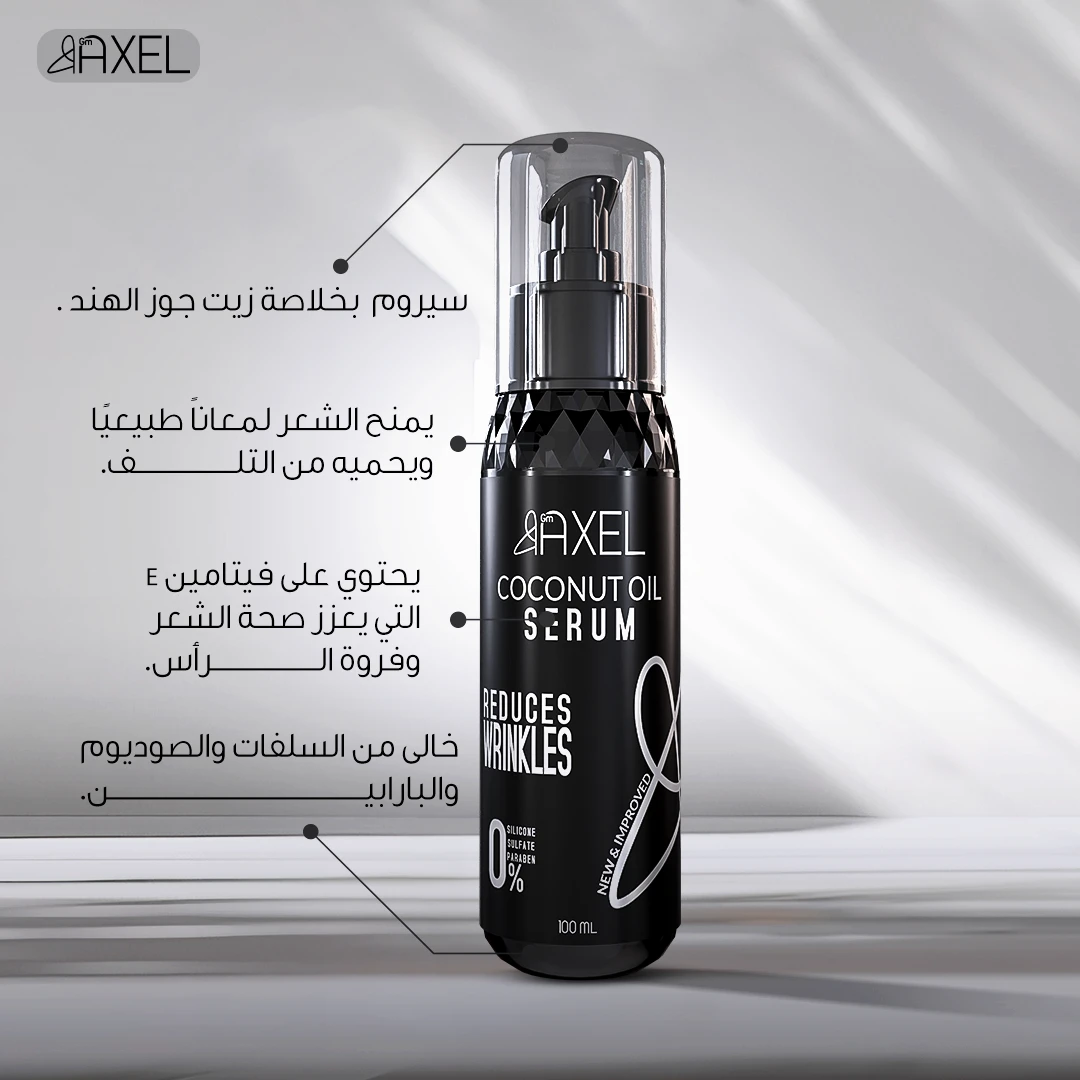سيروم اكسل بجوزة الهند مصمم خصيصًا لتقليل تجاعيد الشعر، وهو خالي تمامًا من السلفات والبارابين والسيليكون والمواد الكيميائية الضارة. يحمي هذا السيروم الشعر من حرارة الأدوات المستخدمة للتصفيف ويمنحه نعومة ملحوظة، كما يضيف لمعانًا للشعر الباهت. يعمل أيضًا على إزالة التشابك وحماية الشعر من التلف والعوامل الخارجية.